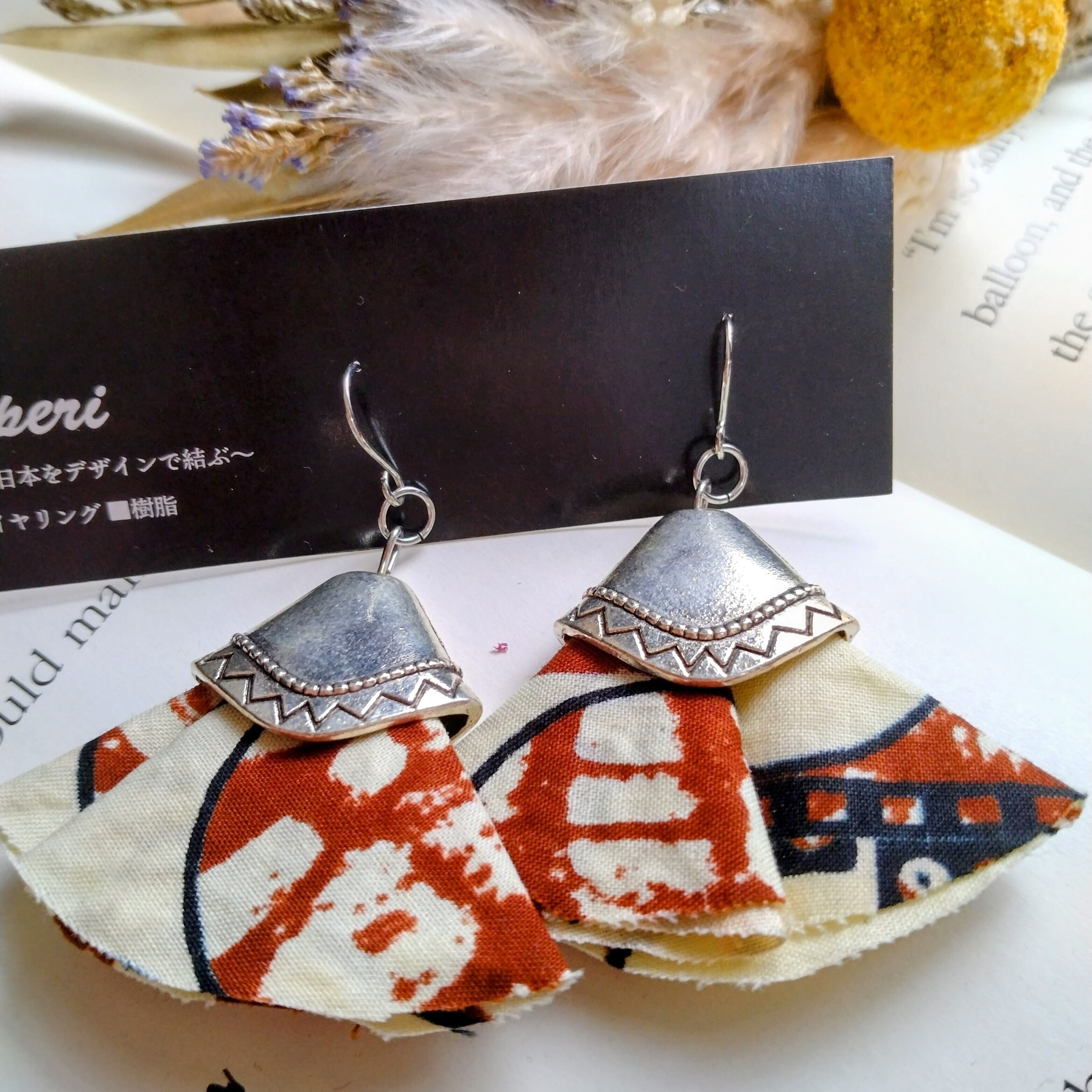 さんかくピアス(イヤリング交換可) №1は、アンティークタッセルキャップをアフリカ布と組み合わせた耳飾りです。個性的なデザインでありながら、上品さも漂う一品です。アフリカ布のカラフルな色使いが、顔を明るく見せてくれます。