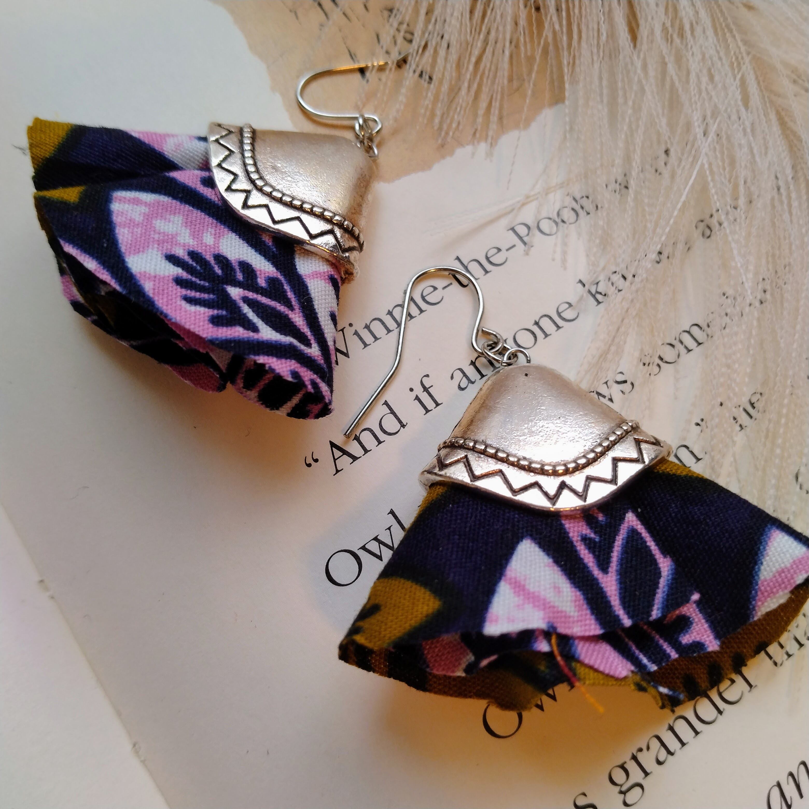 さんかくピアス(イヤリング交換可) №1は、アンティークタッセルキャップをアフリカ布と組み合わせた耳飾りです。個性的なデザインでありながら、上品さも漂う一品です。アフリカ布のカラフルな色使いが、顔を明るく見せてくれます。