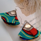 さんかくピアス(イヤリング交換可) №1は、アンティークタッセルキャップをアフリカ布と組み合わせた耳飾りです。個性的なデザインでありながら、上品さも漂う一品です。アフリカ布のカラフルな色使いが、顔を明るく見せてくれます。